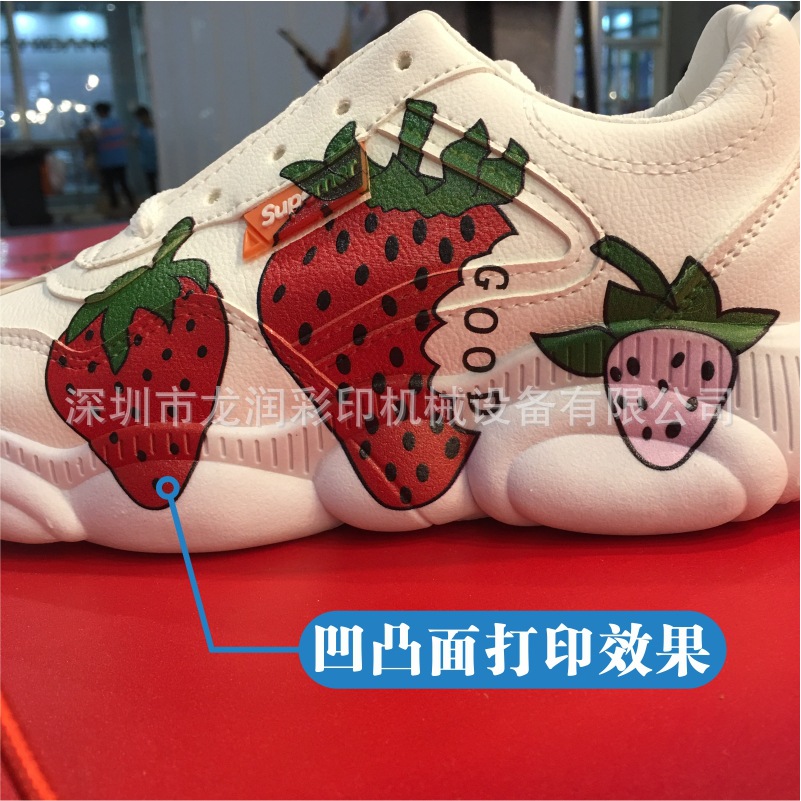 龍潤LR-2513 uv打印機實現(xiàn)從2.5毫米打印距離到2.5厘米打印距離的,直接打印高弧度,實現(xiàn)uv打印高弧面,uv打印異形,uv打印鞋面,uv打印凹凸面,uv打印玩具等高落差產品,無需制版,直接打印。2513UV高落差平板噴墨打印機是針對鞋子/鞋材行業(yè)的專用機型,其有高落差、高噴射、打印精度高、質量好、色彩鮮艷、打印速度快、圖案清晰亮麗、不掉色等特點。打印落差25mm不飛墨,打印方便,無需制版,只要有圖片,連接一臺電腦就可以直接在成品鞋或者鞋材上面印刷自己想要的3D圖案。因為設備針對不同客戶,不同行業(yè),所以在機器配置和機器大小選購方面存在差異,價格也高低不一,客戶在購買機器前務必要咨詢銷售人員,我們才能推薦適合您的機器。